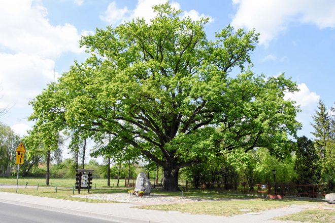 Naprzeciwko kościoła rosną dwa, okazałe (liczące ponad 26 metrów) dęby szypułkowe. Po lewej nosi imię „Stefan” na cześć kardynał Stefana Wyszyńskiego. Dąb z prawej strony ma imię „Fryderyk” na cześć Fryderyka Chopina.