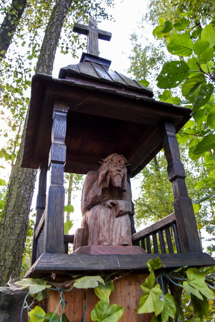 Pod drewnianym dachem siedzi drewniany Jezus Frasobliwy. Trafił tu prosto z Syberii. Zesłany tam oficer wojska polskiego własnoręcznie go wyrzeźbił z drzewa, które sam ściął. Jezus wraz nim wrócił do Polski.